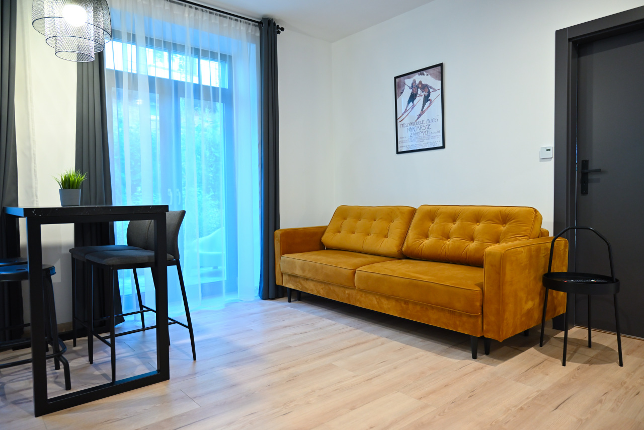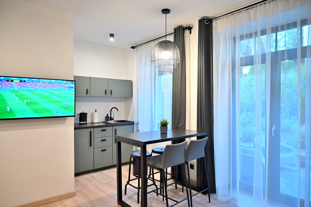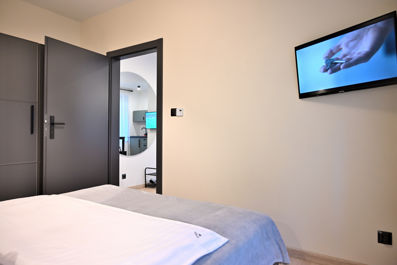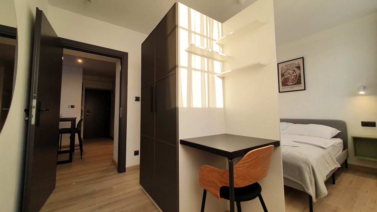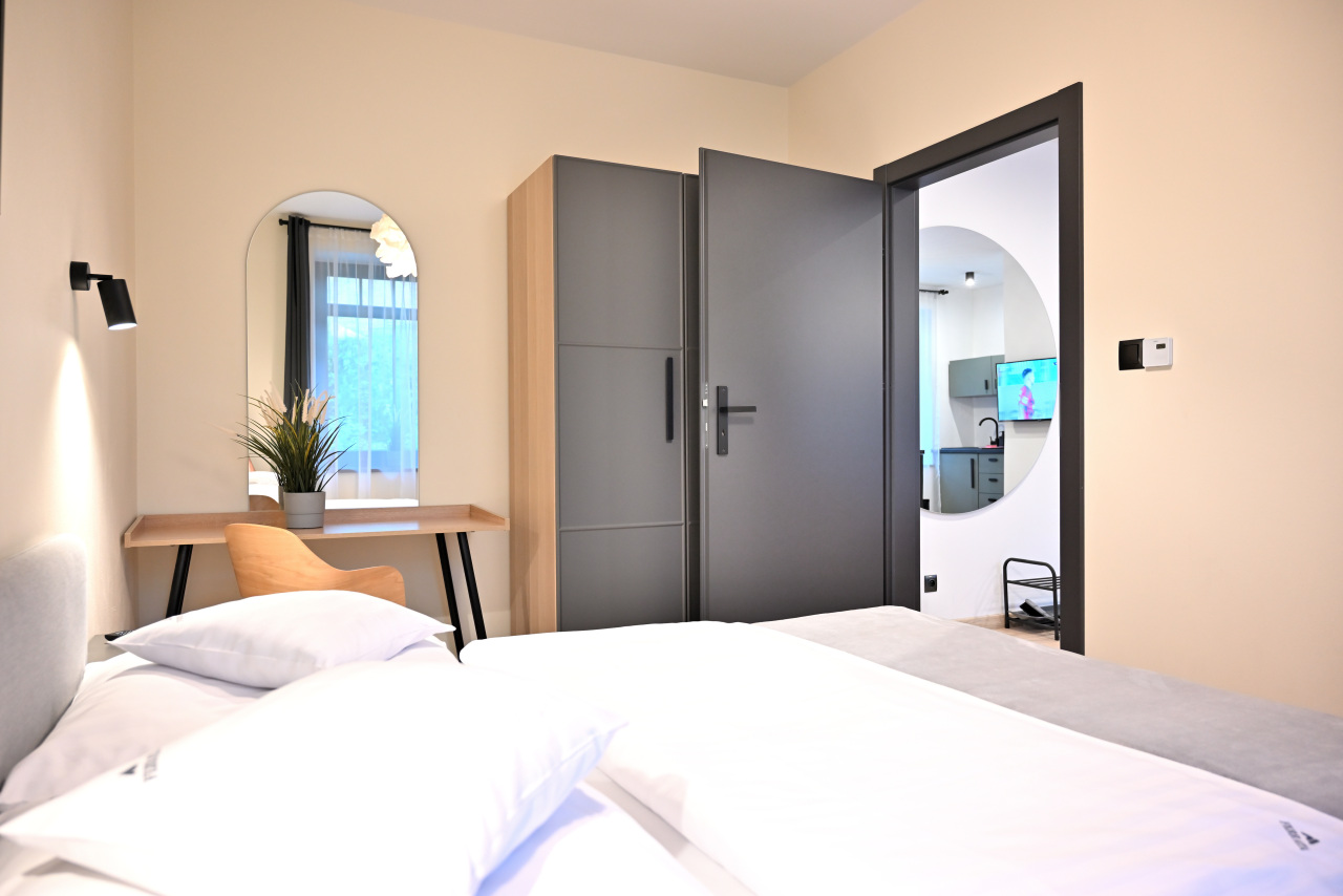 Przestronny apartament z aneksem kuchennym, oddzielną sypialnią, łazienką oraz komfortowym ogrzewaniem podłogowym.